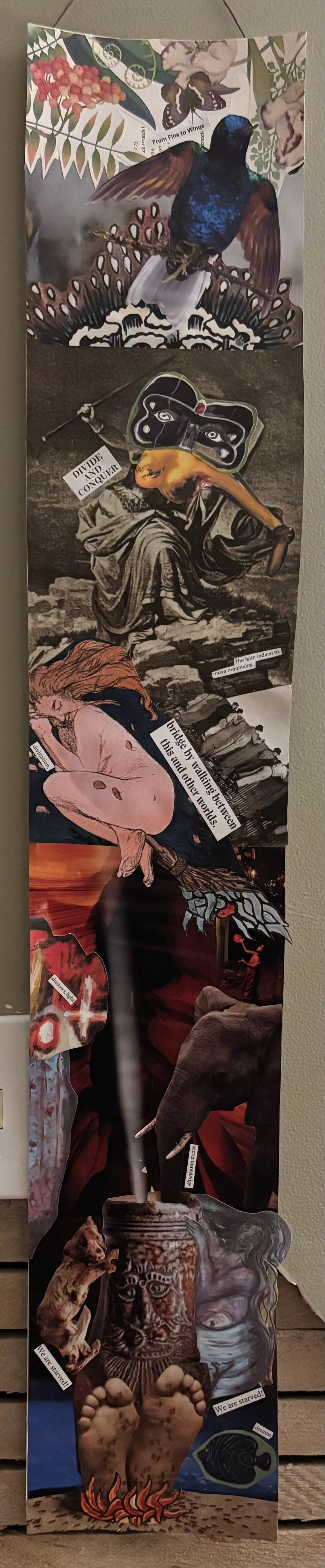 After collaging, there will be time to explore your piece—making associations, noticing connections, and listening for what speaks to you. There will also be space to connect with others and explore our collages together, if you wish. You’re encouraged to participate in whatever way feels most comfortable for you.